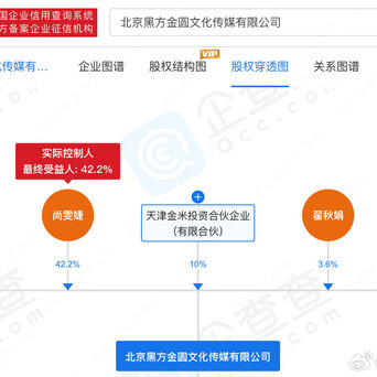 【#尚雯婕卸任经纪公司法定代表人#】#尚雯婕卸任黑金经纪法定代表人#企查查APP显示,近日,北京黑方金圆文化传媒有限公司发生工商变更,尚雯婕卸任法定代表人职务,由陶福明接任,目前其仍持有该公司42%左右股份,并担任董事长、经理职务。信息显示,北京黑方金圆文化传媒有限公司成立于2014年4月,注册资本222.22万元,是一家专注打造优质年轻艺人的经纪公司,曾签约侯明昊与曾舜晞等艺人。