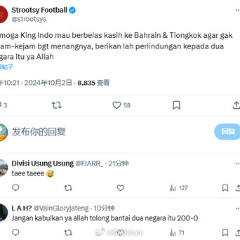 印尼的崛起也让激进球迷狂喜,之前号称要13-1澳大利亚的印尼球迷这次改走调侃路线:希望印尼王对巴林和中国仁慈一点,不要踢得太残忍,保佑他们别输太惨……